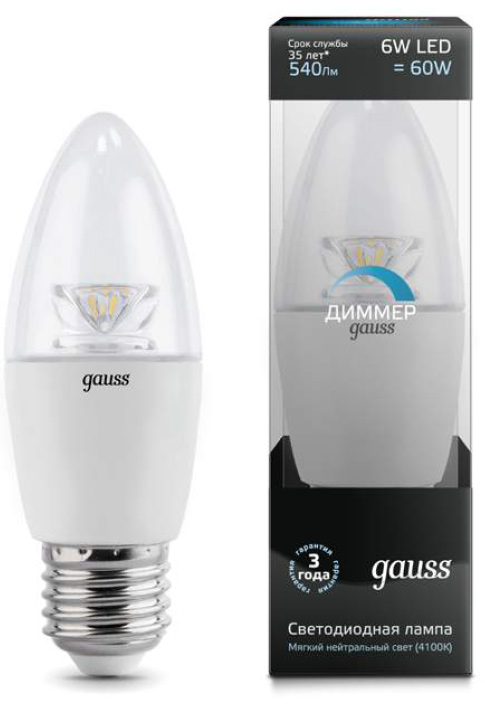 Лампа светодиодная диммируемая E27 6W 4100К свеча прозрачная 103202206-D