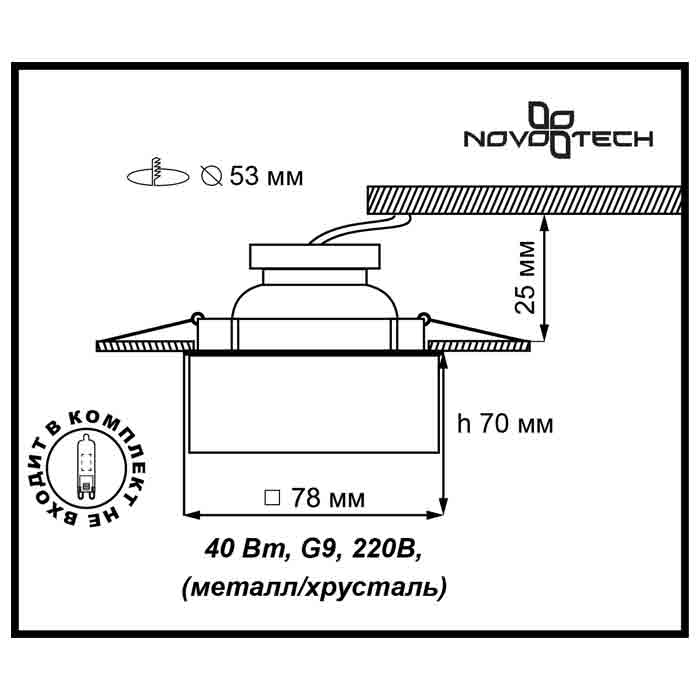Размер врезного отверстия 53 мм/30 мм Длина 78 мм Ширина 78 мм Лампочки