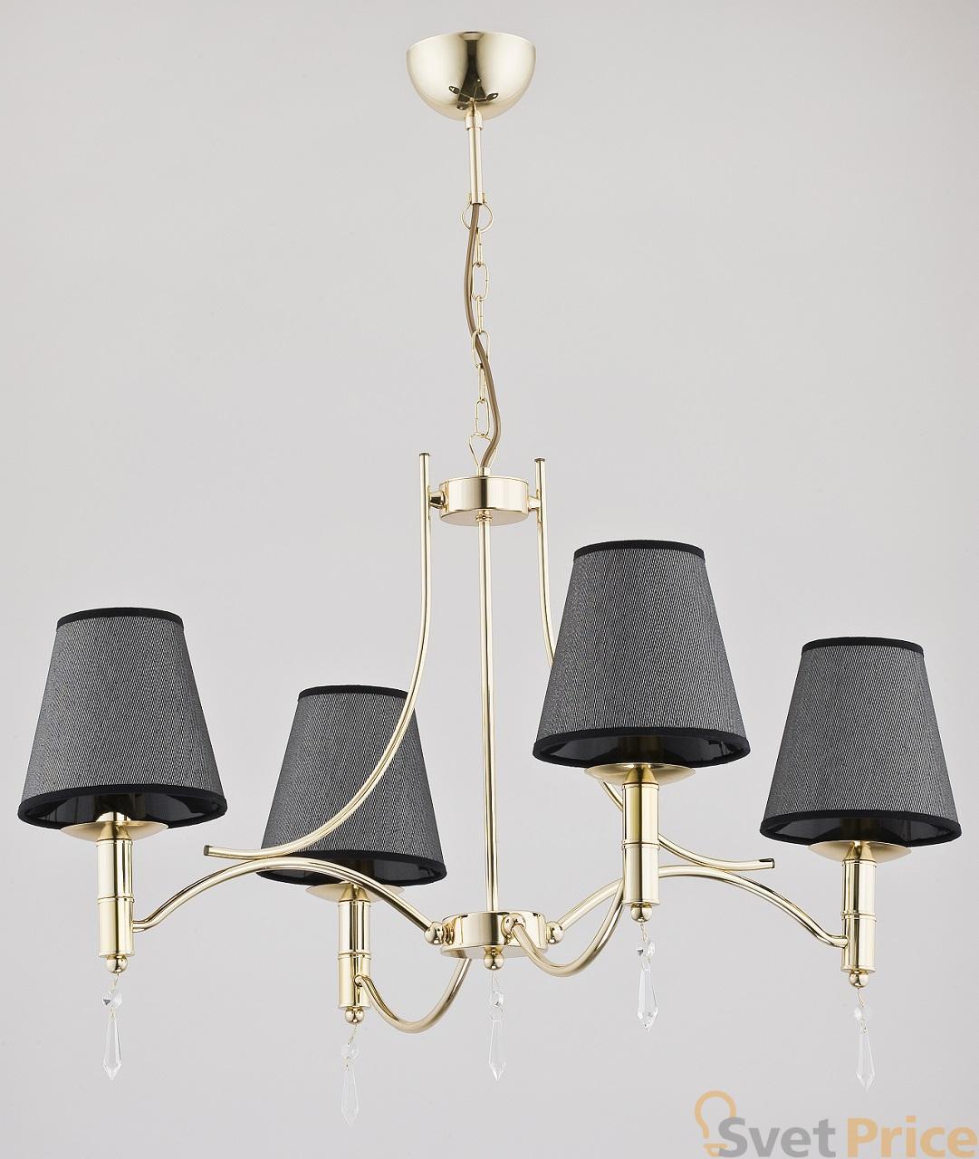 Подвесная люстра Alfa из коллекции Abil Gold производства Польша. Люстра 23024 имеет цоколь E14, в конструкции используются текстильные виды материалов, металлическая арматура золотого цвета и 4 черных плафона из материала ткань.