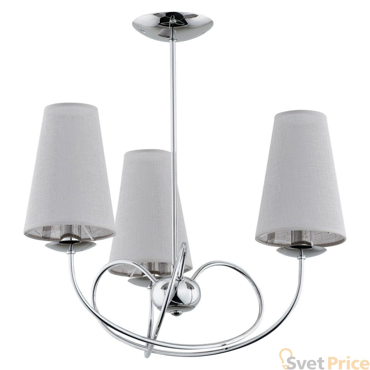 Подвесная люстра Alfa из коллекции Rete производства Польша. Люстра 20443 имеет цоколь E14, в конструкции используются текстильные виды материалов, металлическая арматура цвета хром и 3 серых плафона из материала ткань.