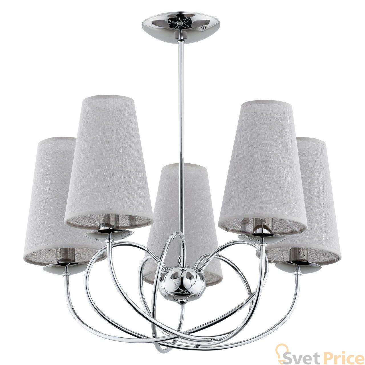 Подвесная люстра Alfa из коллекции Rete производства Польша. Люстра 20445 имеет цоколь E14, в конструкции используются текстильные виды материалов, металлическая арматура цвета хром и 5 серых плафона из материала ткань.