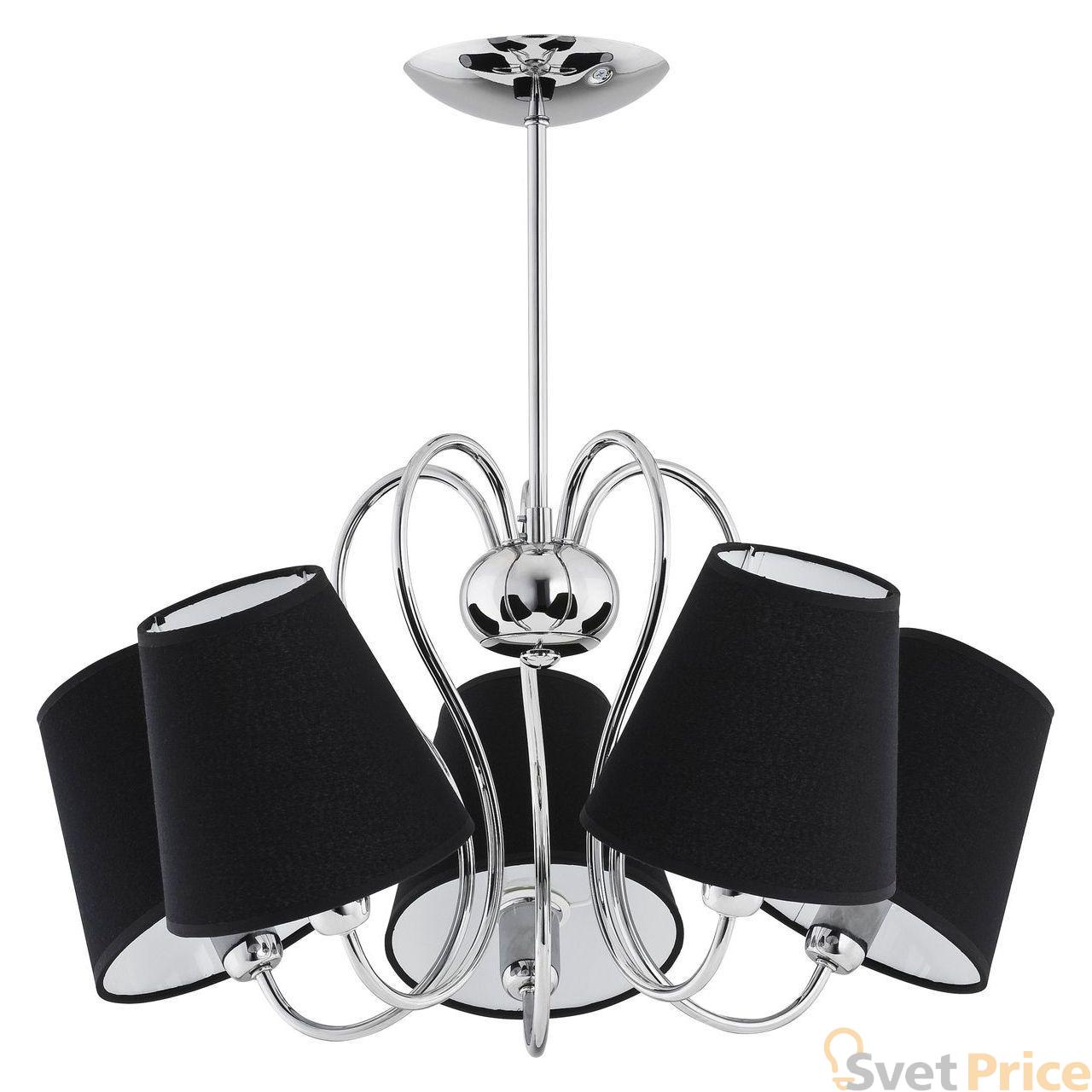 Подвесная люстра Alfa из коллекции Ribera производства Польша. Люстра 11555 имеет цоколь E14, в конструкции используются текстильные виды материалов, металлическая арматура цвета хром и 5 черных плафона из материала ткань.