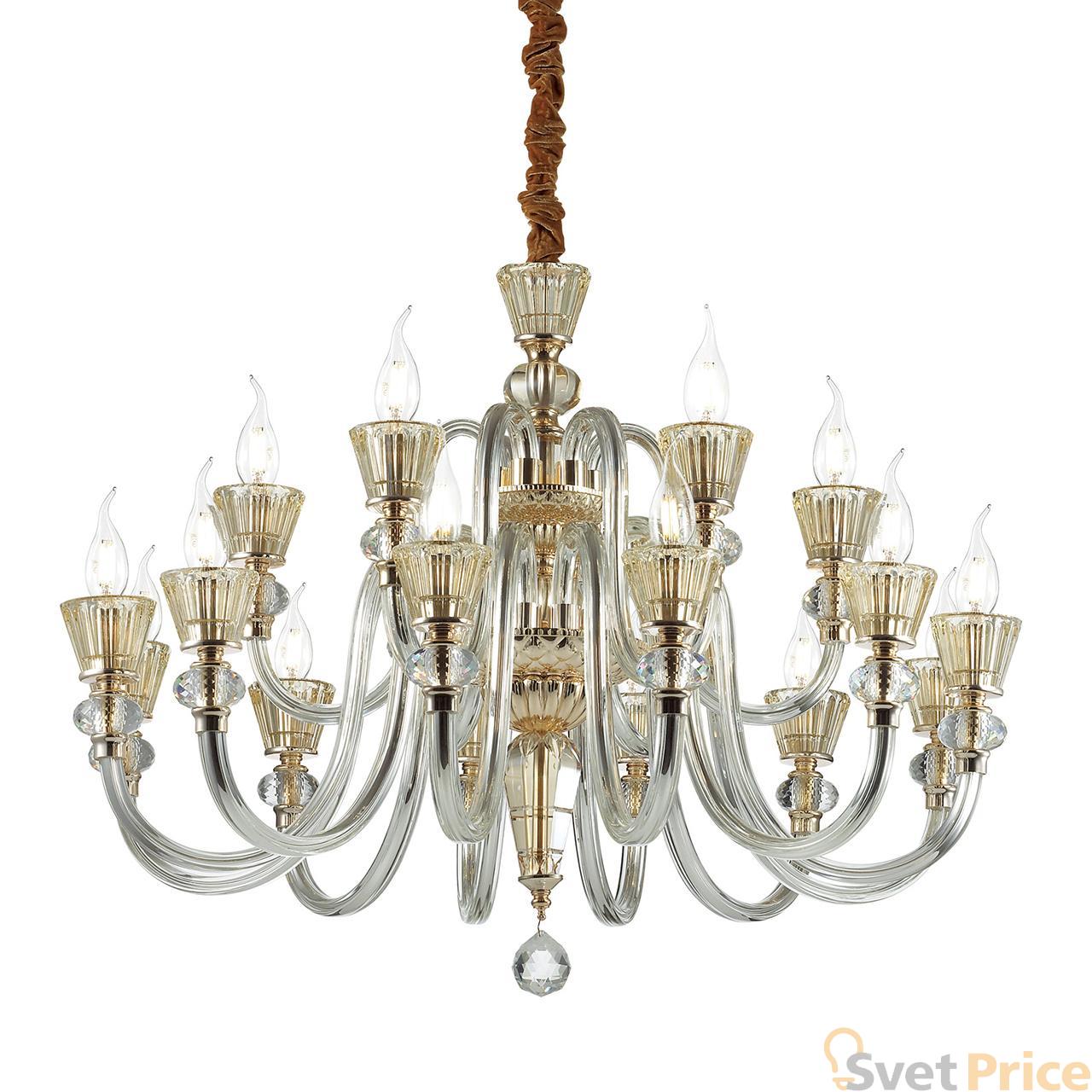 Большая люстра Ideal Lux из коллекции Strauss, страна производства Италия. Люстра Strauss SP18 в стиле арт-деко имеет цоколь E14, в конструкции используются стеклянные виды материалов, металлическая арматура золотого цвета, количество ламп 18. Рекомендовано использование для больших залов.