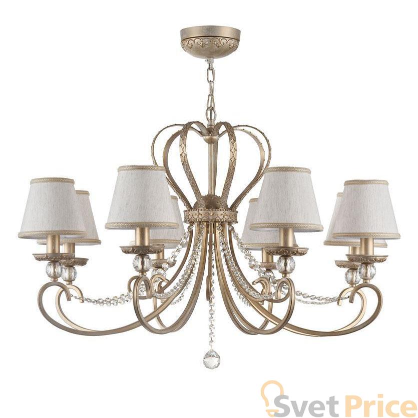 Подвесная люстра Maytoni из коллекции Livorno производства Германия. Люстра ARM144-08-WG имеет цоколь E14, в конструкции используются текстильные виды материалов, металлическая арматура золотого цвета и 8 белых плафона из материала ткань.