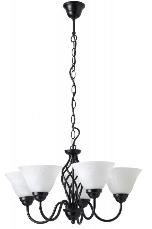 Подвесная люстра Brilliant из коллекции Elena производства Германия. Люстра 66773/76 имеет цоколь E14, в конструкции используются кованые виды материалов, металлическая арматура черного цвета и 5 белых плафона из материала стекло.