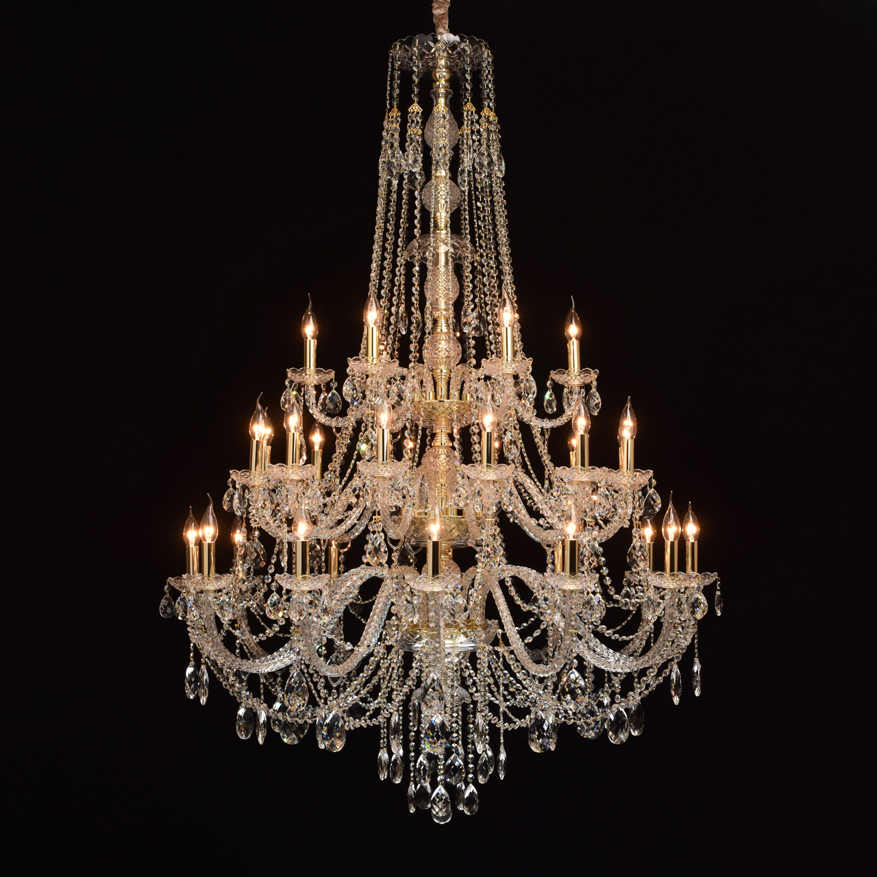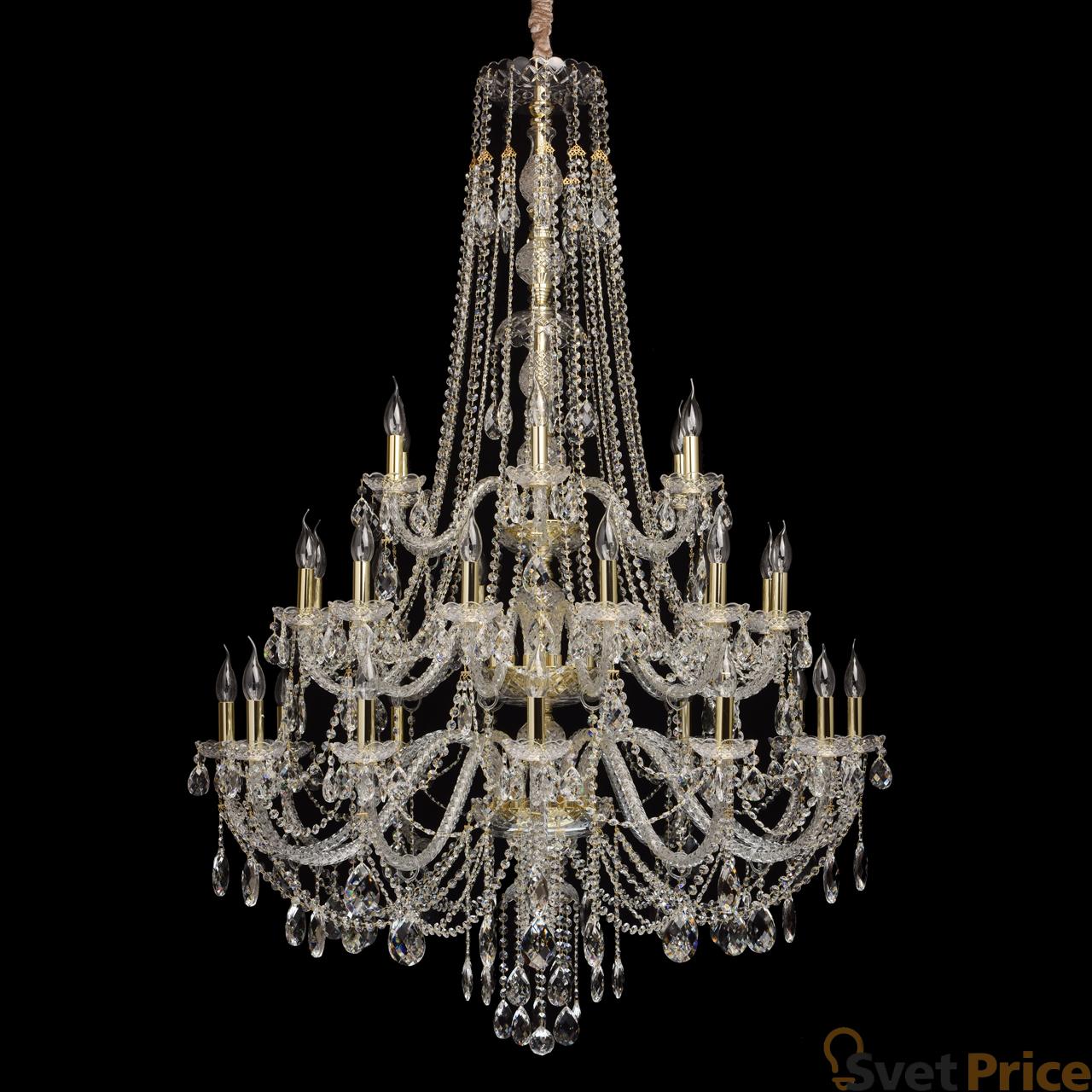 Большая люстра CHIARO из коллекции Каролина 14, страна производства Германия. Люстра 367015630 в стиле классика имеет цоколь E14, в конструкции используются хрустальные виды материалов, металлическая арматура золотого цвета, количество ламп 30. Рекомендовано использование для больших залов.