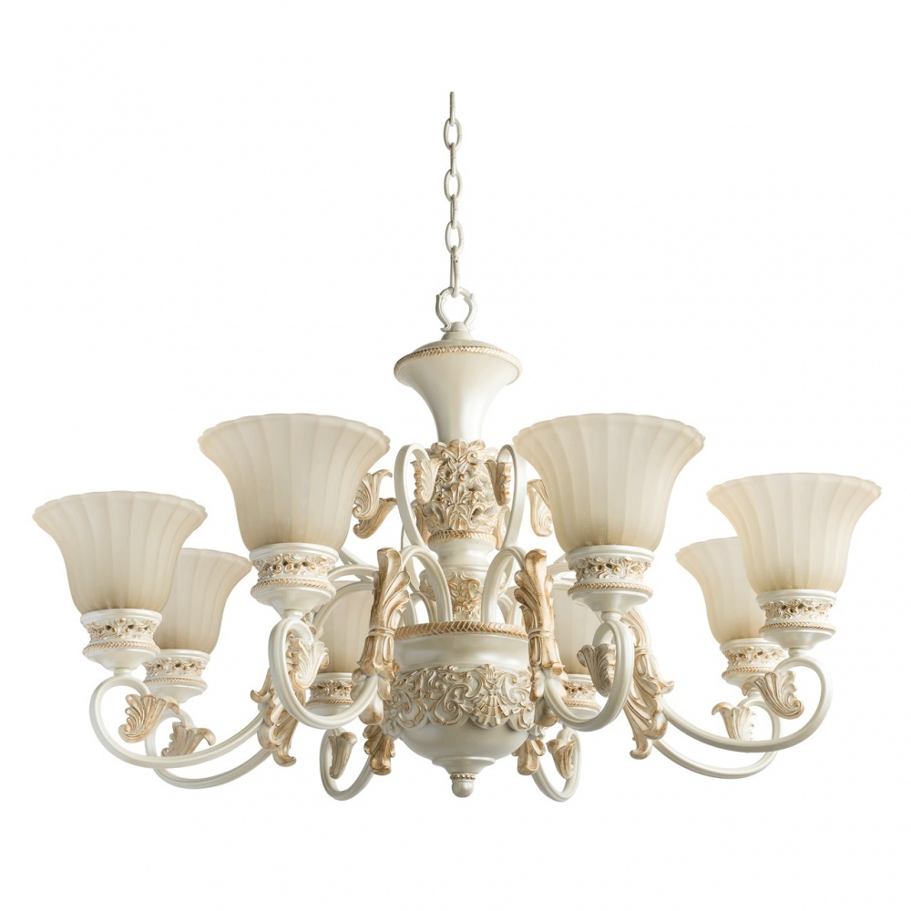 Большая люстра CHIARO из коллекции Лоренцо производства Германия. Люстра 621010208 имеет цоколь E27, в конструкции используются стеклянные виды материалов, металлическая арматура белого цвета и 8 бежевых плафона из материала стекло.