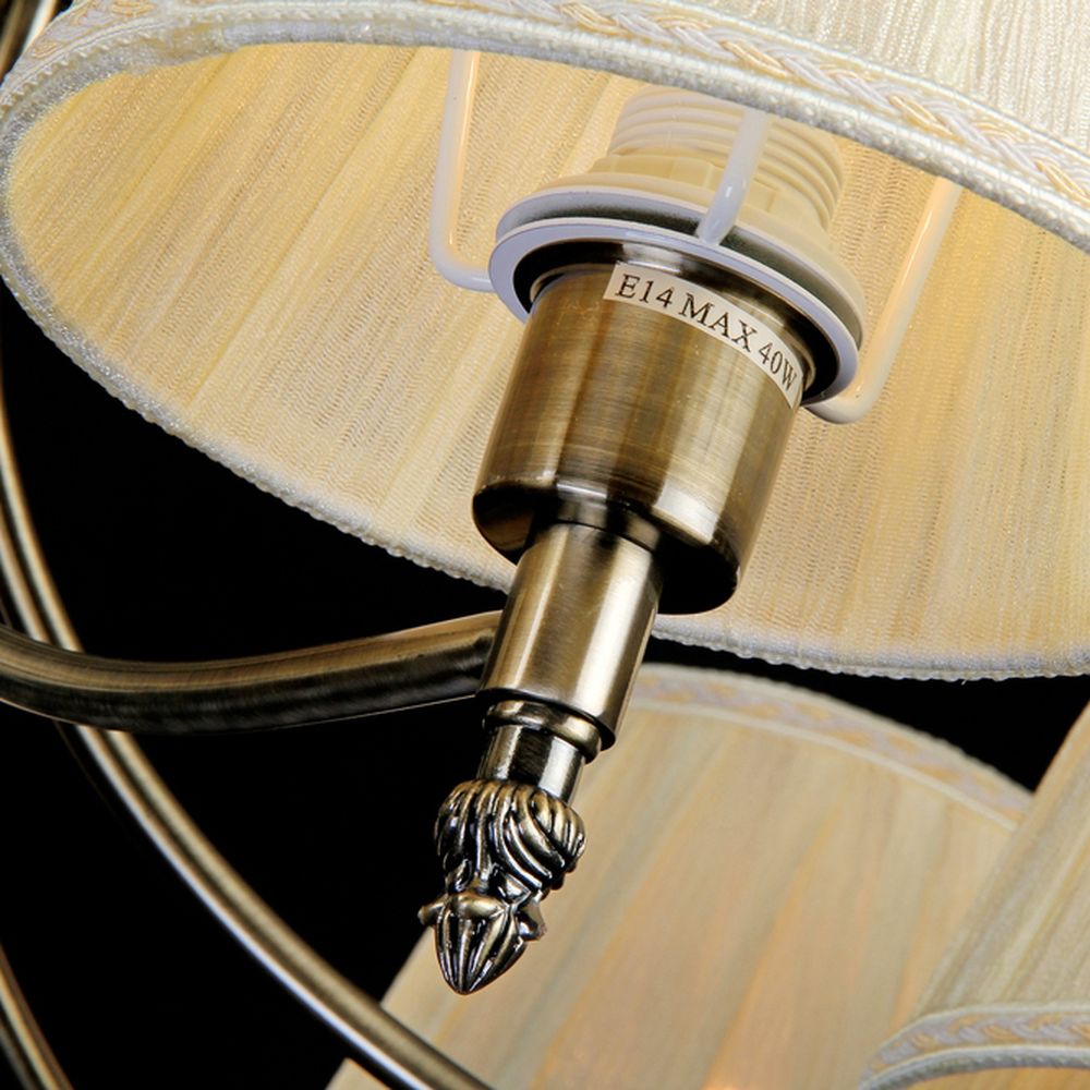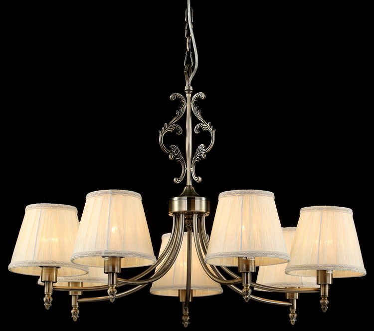 Подвесная люстра Maytoni из коллекции Vesta производства Германия. Люстра ARM330-07-R имеет цоколь E14, в конструкции используются текстильные виды материалов, металлическая арматура бронзового цвета и 7 молочного цвета плафона из материала ткань.