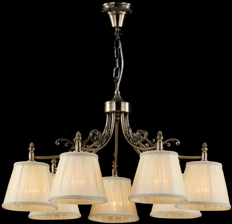 Подвесная люстра Maytoni из коллекции Vesta производства Германия. Люстра ARM331-07-R имеет цоколь E14, в конструкции используются текстильные виды материалов, металлическая арматура бронзового цвета и 7 белых плафона из материала ткань.