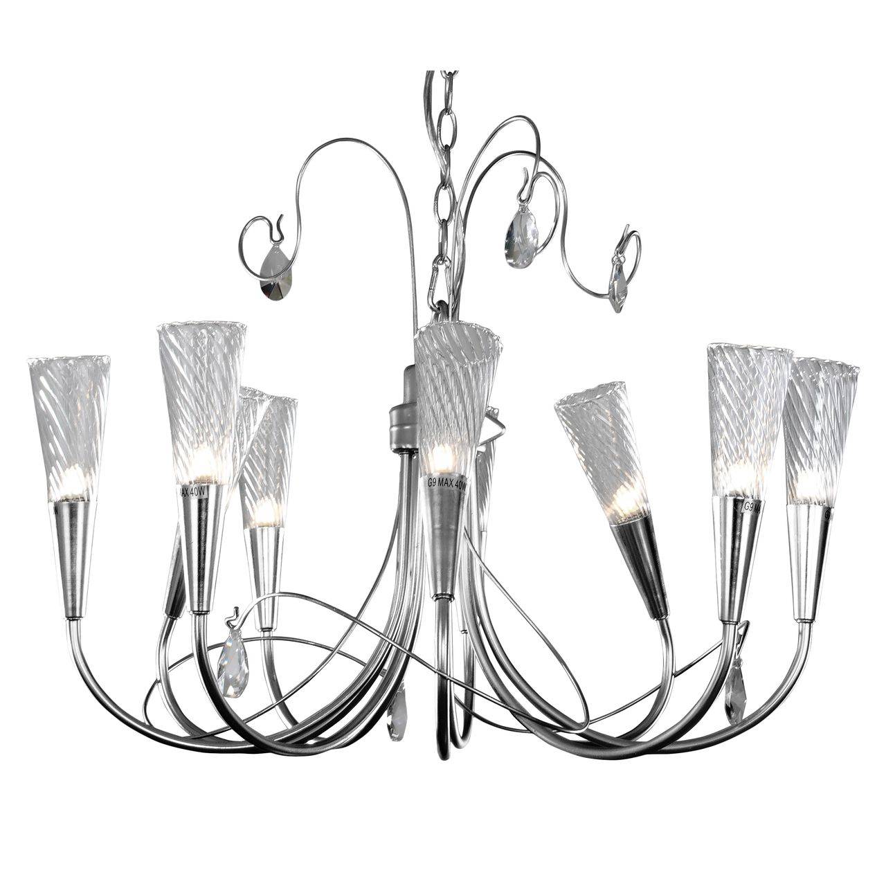 Подвесная люстра Osgona из коллекции Aereo производства Италия. Люстра 711094 имеет цоколь G9, в конструкции используются металлические виды материалов, металлическая арматура серебристого цвета и 9 прозрачных плафона из материала стекло.