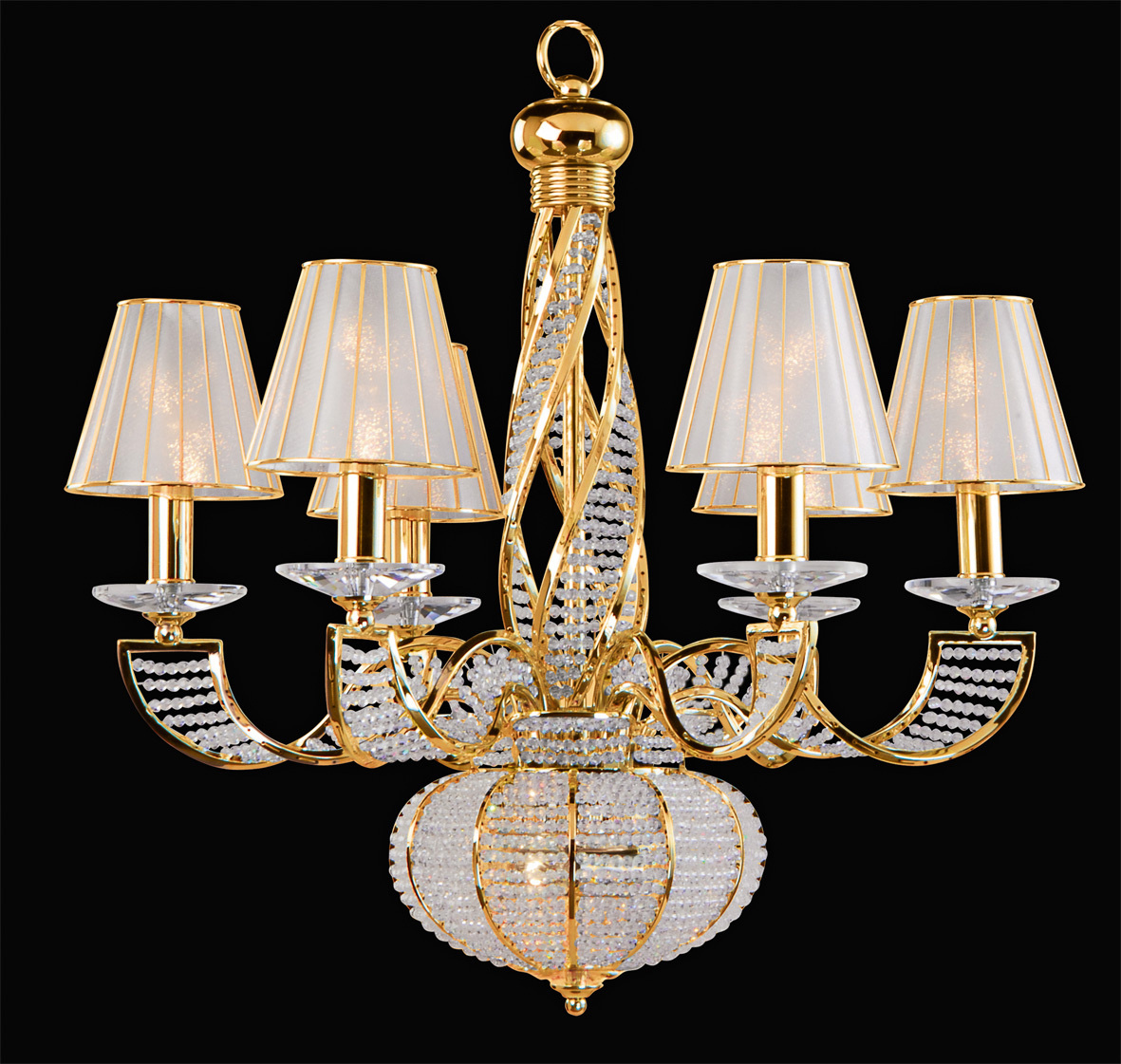 Подвесная люстра Osgona из коллекции Alveare производства Италия. Люстра 702102 имеет цоколь E14, в конструкции используются текстильные виды материалов, металлическая арматура золотого цвета и 10 белых плафона из материала ткань.