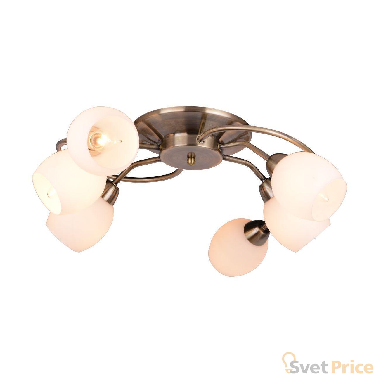Потолочная люстра Arte Lamp из коллекции Silvana производства Италия. Люстра A4033PL-6AB имеет цоколь E14, в конструкции используются стеклянные виды материалов, металлическая арматура бронзового цвета и 6 белых плафона из материала стекло.