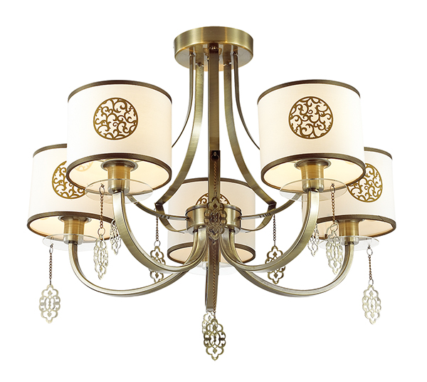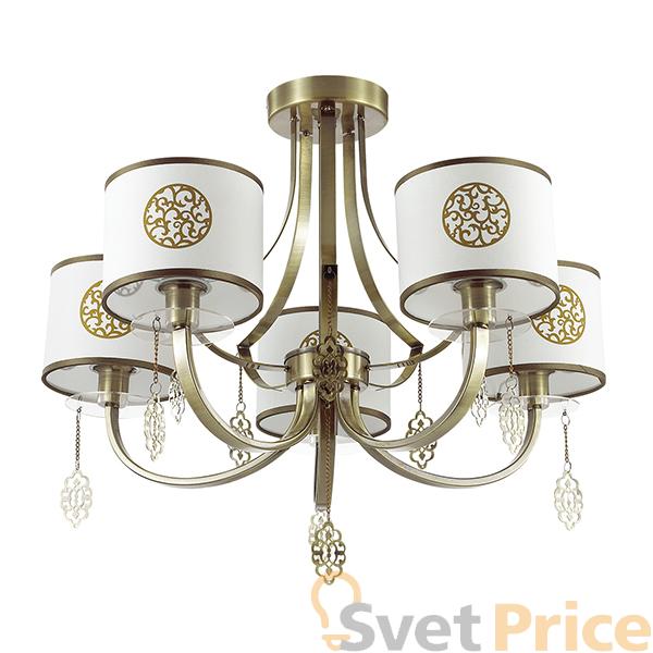 Потолочная люстра Lumion из коллекции Enna производства Италия. Люстра 3399/5C имеет цоколь E14, в конструкции используются текстильные виды материалов, металлическая арматура бронзового цвета и 5 белых плафона из материала ткань.